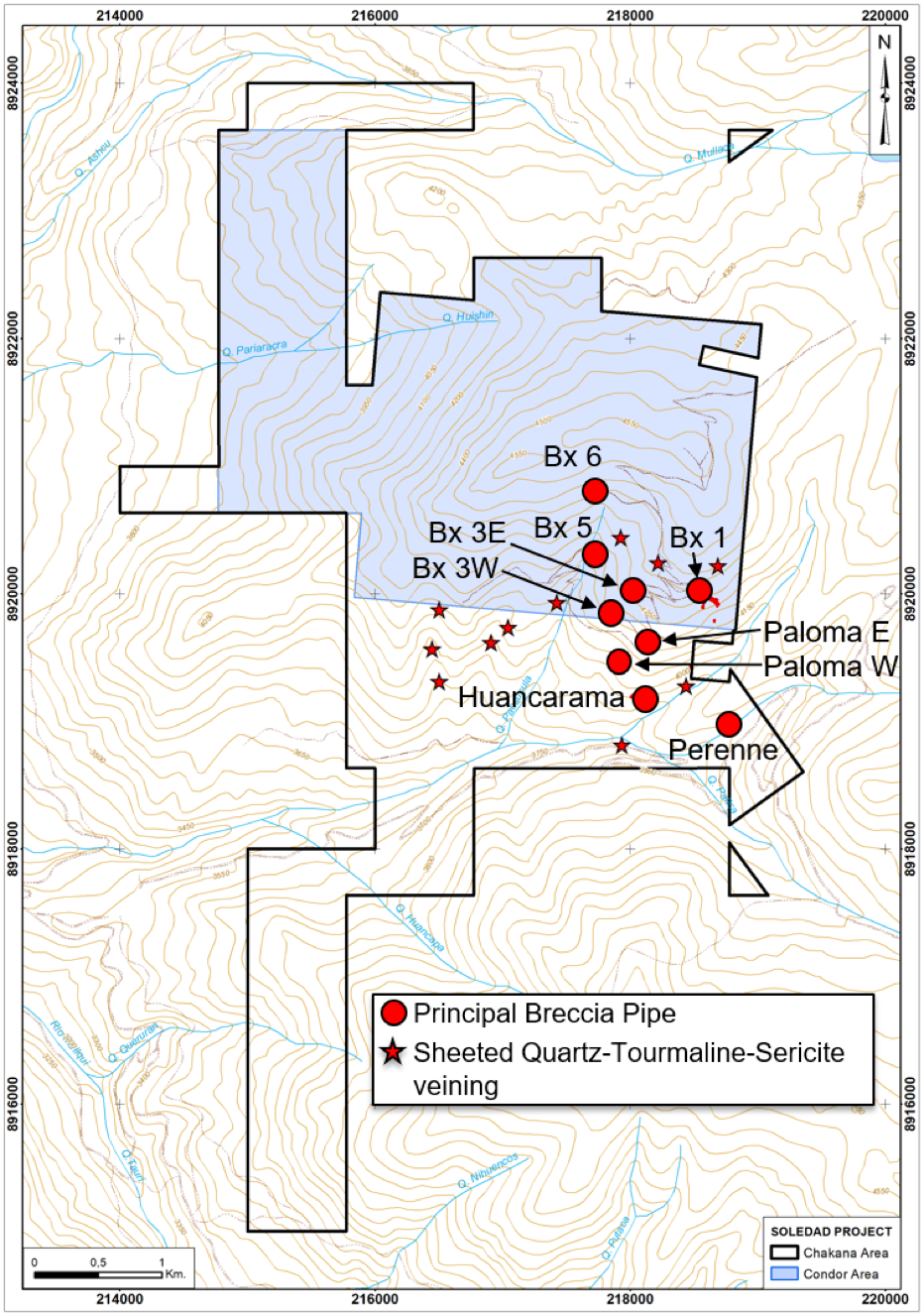 “The expansion and consolidation of our mineral rights at Soledad is strategic as it covers four additional mineralized tourmaline breccia pipes and it allows access to the cluster of breccia pipes from the valley below”, said President and CEO David Kelley. “The four additional pipes include the Huancarama Breccia Complex, Paloma East and West pipes, and Perenne, bringing the total number of principal pipes to nine. All have characteristic surface mineralization and breccia textures that make them highly prospective drill targets. In addition, there are eleven areas with strongly altered andesitic volcanic rock consisting of sheeted quartz-sericite-tourmaline veining now believed to be the vertical expression of blind breccia bodies,” added Mr. Kelley.