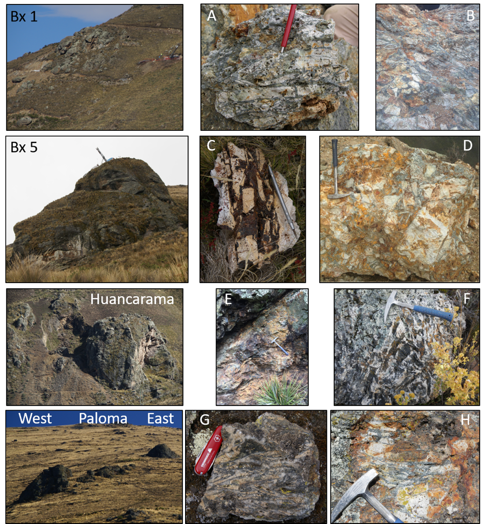 Figure 4 - Images showing surface expression of Bx 1, Bx 5, Huancarama Breccia Complex, and Paloma East and West. Note drill rig for scale for Bx1 and Bx5. Main massif on right at Huancarama measures approximately 60 m accross. Distance between Paloma East and Paloma West is 220 metres. Rock samples from: Bx1 (A) shingle breccia, (B) mosaic breccia (field of view 1.5m wide); Bx 5 (C) shingle breccia, (D) mosaic breccia; Huancarama (E) mosaic breccia, (F) shingle breccia; Paloma West (G) shingle breccia, Paloma East (H) shingle breccia.