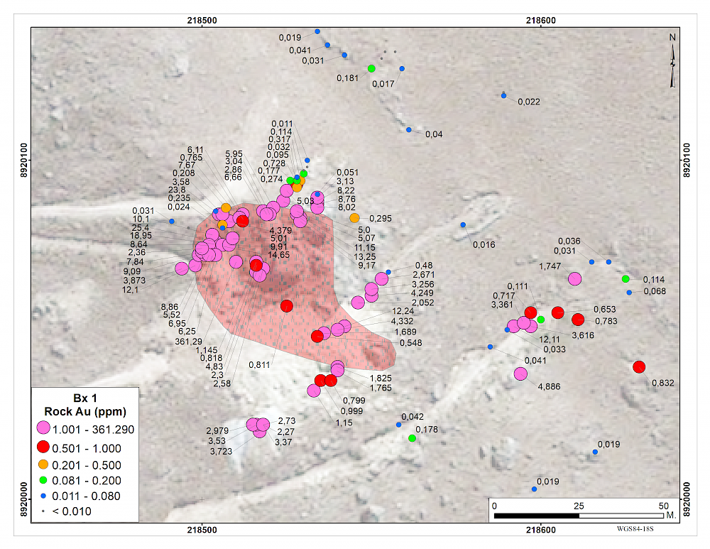 “These sampling results are highly encouraging as they suggest a style of mineralization similar to what we have already drilled in Bx 1 and Bx 5. The Huancarama Breccia Complex is especially exciting as it is the largest exposure of mineralized breccia we have encountered thus far at surface,” states Kelley.