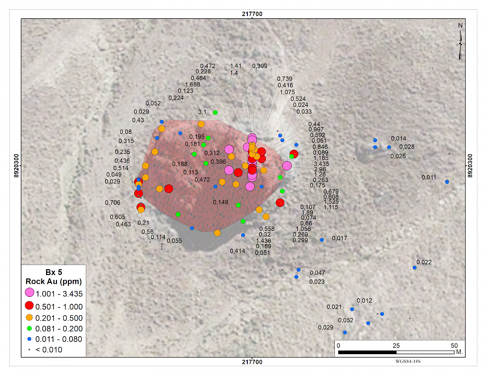 Previous surface rock chip and channel sampling over Breccia Pipes 1 and 5 (Bx 1 and Bx 5, respectively) by Condor Resources and Mariana Resources show strongly anomalous gold results (Fig. 2). Recent rock chip and channel sampling by Chakana over the Paloma and Huancarama pipes show a similar strong geochemical response to Bx1 and Bx5 (Fig. 3). Sampling of the Perenne pipe is in progress.