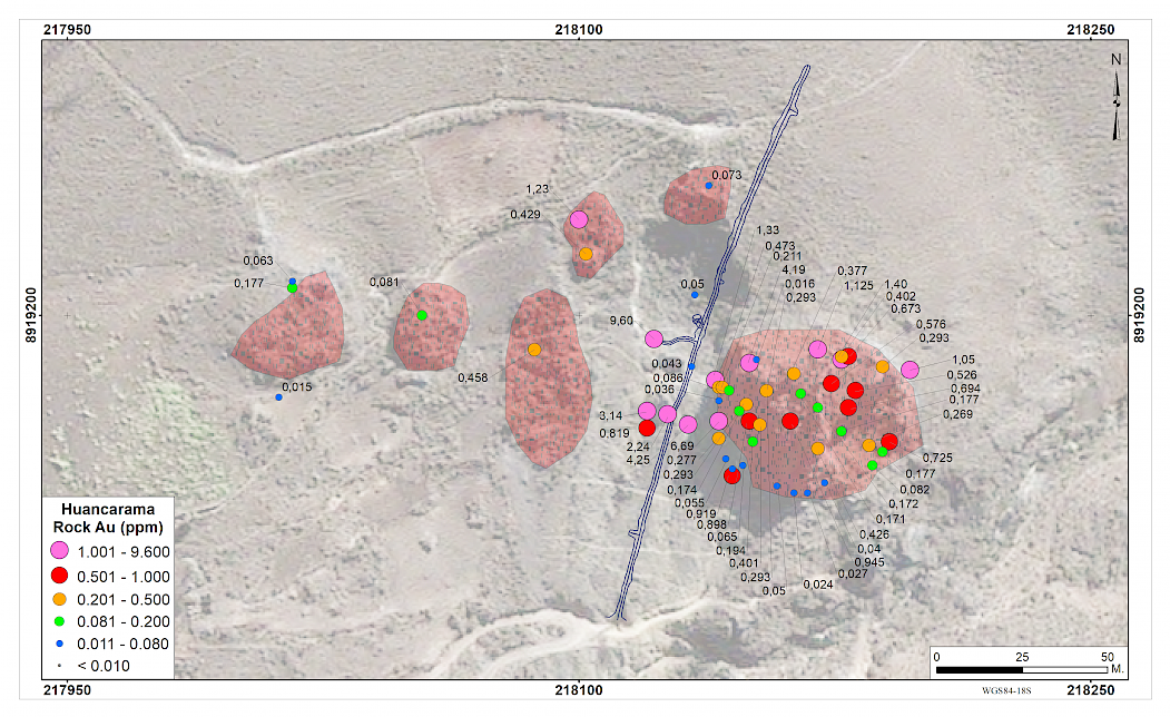 Huancarama is a breccia complex with a main massif on the east that measures approximately 60 metres in diameter. It is surrounded by 5 additional breccia bodies that extend to the west for 200 metres and a collapse zone adjacent to the massif that measures 30 by 50 metres (Fig. 3). The main massif is strongly anomalous in gold with values up to 9.6 g/t Au. Limited sampling of the peripheral breccia bodies show that they are anomalous with values up to 1.23 g/t Au. The collapse feature is reported to have resulted from historic underground removal of mineralized material allowing the ground above to collapse. The breccia complex is at an elevation of 3,950 metres, 450 metres below the highest pipe Breccia Pipe 6 (Bx 6) with an elevation of 4,400 metres.