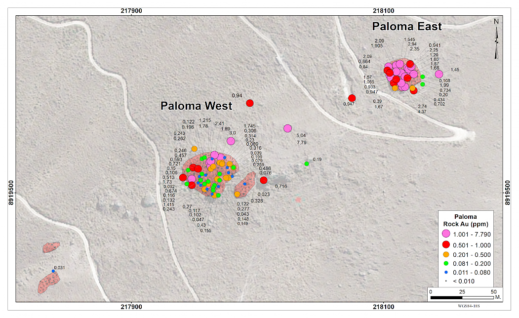 The Paloma pipes include two prominent breccia pipes along a northeast trending structural zone (Fig. 3). Paloma East is a conical shaped pipe with a diameter of 25 metres. The larger Paloma West pipe measures 30 by 40 metres and is surrounded by smaller breccia bodies and strongly sericite-altered andesitic tuff. The northeast trending Paloma zone measures 340 metres and ranges in elevation from 4,000 to 4,165 metres. Surface rock samples are strongly anomalous with values up to 7.79 g/t Au (Fig. 3).
