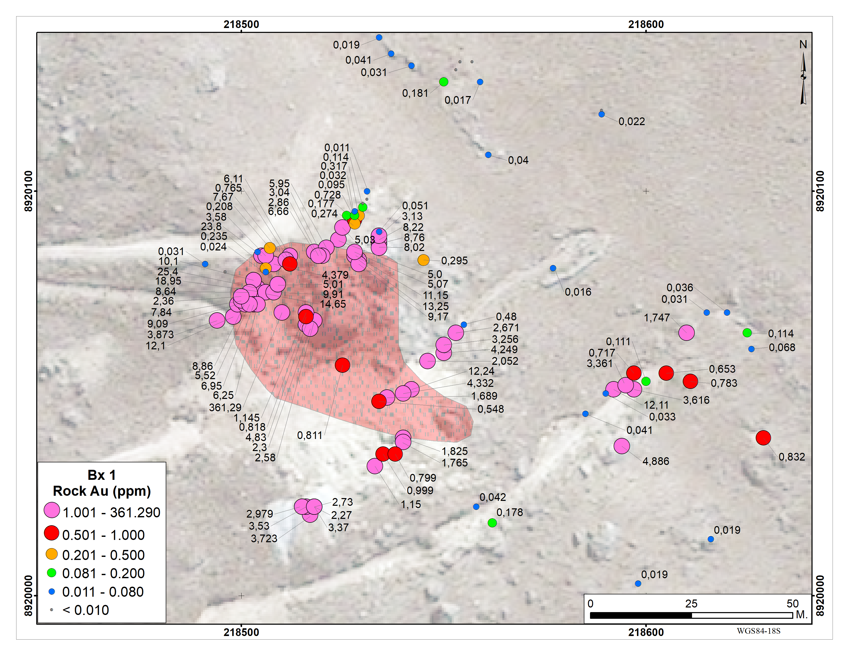 Previous surface rock chip and channel sampling over Breccia Pipes 1 and 5 (Bx 1 and Bx 5, respectively) by Condor Resources and Mariana Resources show strongly anomalous gold results (Fig. 2). Recent rock chip and channel sampling by Chakana over the Paloma and Huancarama pipes show a similar strong geochemical response to Bx1 and Bx5 (Fig. 3). Sampling of the Perenne pipe is in progress.