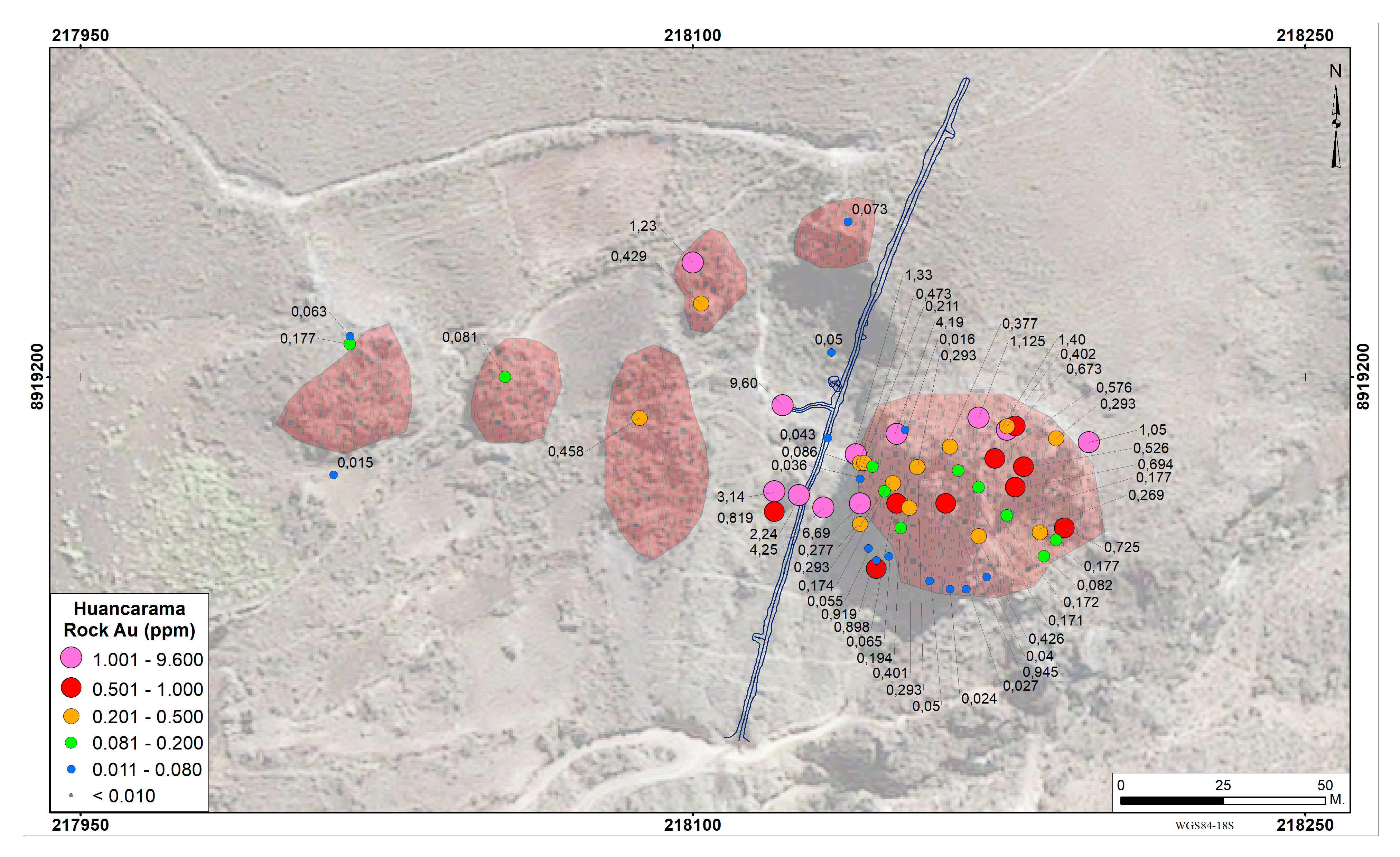 Huancarama is a breccia complex with a main massif on the east that measures approximately 60 metres in diameter. It is surrounded by 5 additional breccia bodies that extend to the west for 200 metres and a collapse zone adjacent to the massif that measures 30 by 50 metres (Fig. 3). The main massif is strongly anomalous in gold with values up to 9.6 g/t Au. Limited sampling of the peripheral breccia bodies show that they are anomalous with values up to 1.23 g/t Au. The collapse feature is reported to have resulted from historic underground removal of mineralized material allowing the ground above to collapse. The breccia complex is at an elevation of 3,950 metres, 450 metres below the highest pipe Breccia Pipe 6 (Bx 6) with an elevation of 4,400 metres.