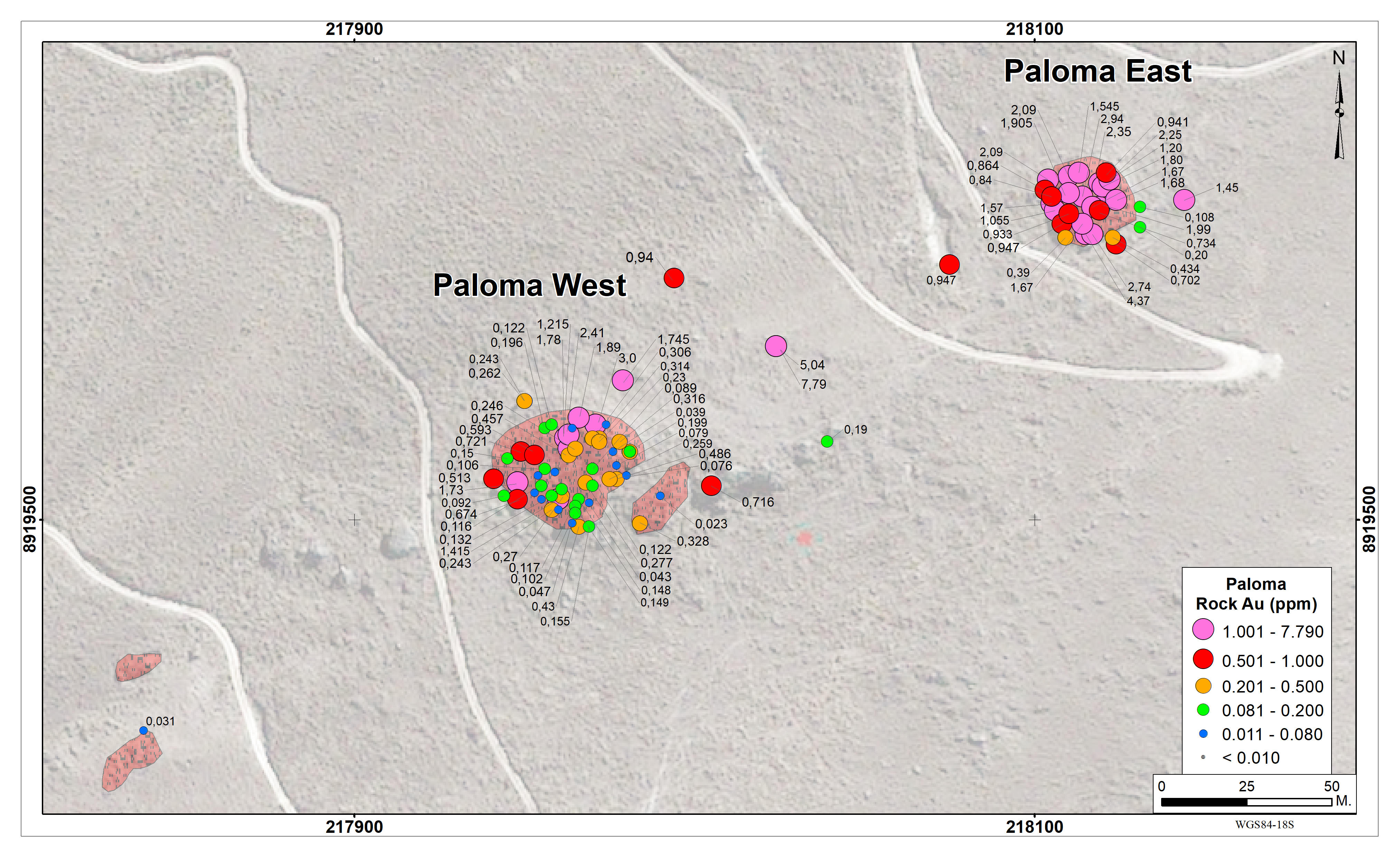 The Paloma pipes include two prominent breccia pipes along a northeast trending structural zone (Fig. 3). Paloma East is a conical shaped pipe with a diameter of 25 metres. The larger Paloma West pipe measures 30 by 40 metres and is surrounded by smaller breccia bodies and strongly sericite-altered andesitic tuff. The northeast trending Paloma zone measures 340 metres and ranges in elevation from 4,000 to 4,165 metres. Surface rock samples are strongly anomalous with values up to 7.79 g/t Au (Fig. 3).