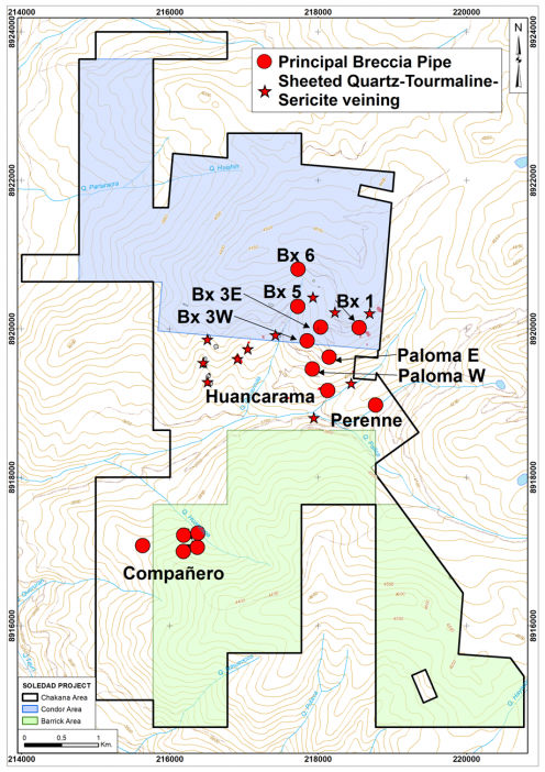“We are excited to have completed this agreement with Barrick, which significantly expands our mineral rights to the south of Soledad and brings a new cluster of mineralized tourmaline breccia pipes and occurrences to the project”, said President and CEO David Kelley. “The new cluster, referred to as Compañero, is located 2.5 km southwest of the main cluster of pipes at Soledad. The cluster consists of 5 principle tourmaline breccia bodies, one of which has a prominent outcrop like many of the other known breccia pipes in the Soledad cluster (Fig. 2).” These breccias occur in both andesitic tuff of the Calipuy formation, and arenite of the Chimu formation. Results from surface sampling shows strongly anomalous gold from composite rock chip samples with results up to 14.25 g/t Au (Figs. 3a and 3b). These results are highly significant as they suggest similar mineralization to what has already been drilled in Bx 1 and Bx 5 over the last 11 months. The 5 breccia pipes at Compañerobring the project total to 14 known pipes, with an additional 11 areas having strongly altered andesitic volcanic rock consisting of sheeted quartz-sericite-tourmaline veining believed to be the vertical expression of blind breccia bodies.