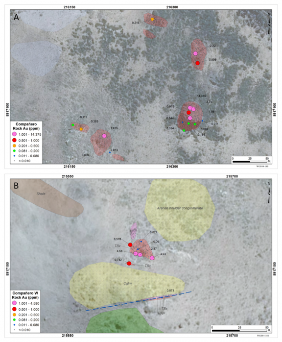 Figure 3 – Maps showing gold in surface composite rock chip samples collected by Chakana over (A) the main Compañero cluster, and (B) the Compañero West pipe. Readers are cautioned that surface rock samples are, by nature, selective and are unlikely to represent average grades on the Project.