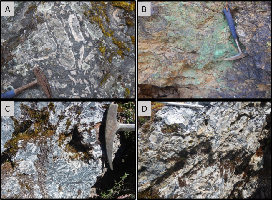 Figure 4 –Images showing breccia textures and assayalues in samples collected from the Compañero cluster; A) mosaic breccia with tourmaline matrix from prominent outcropping breccia pipe, 14.25 g/t Au; B) malachite-stained quartz-tourmaline breccia, 2.22 g/t Au and 0.13% Cu; C) chaotic shingle breccia, 1.91 g/t Au; and D) shingle-shaped quartz arenite clasts, 4.03 g/t Au.