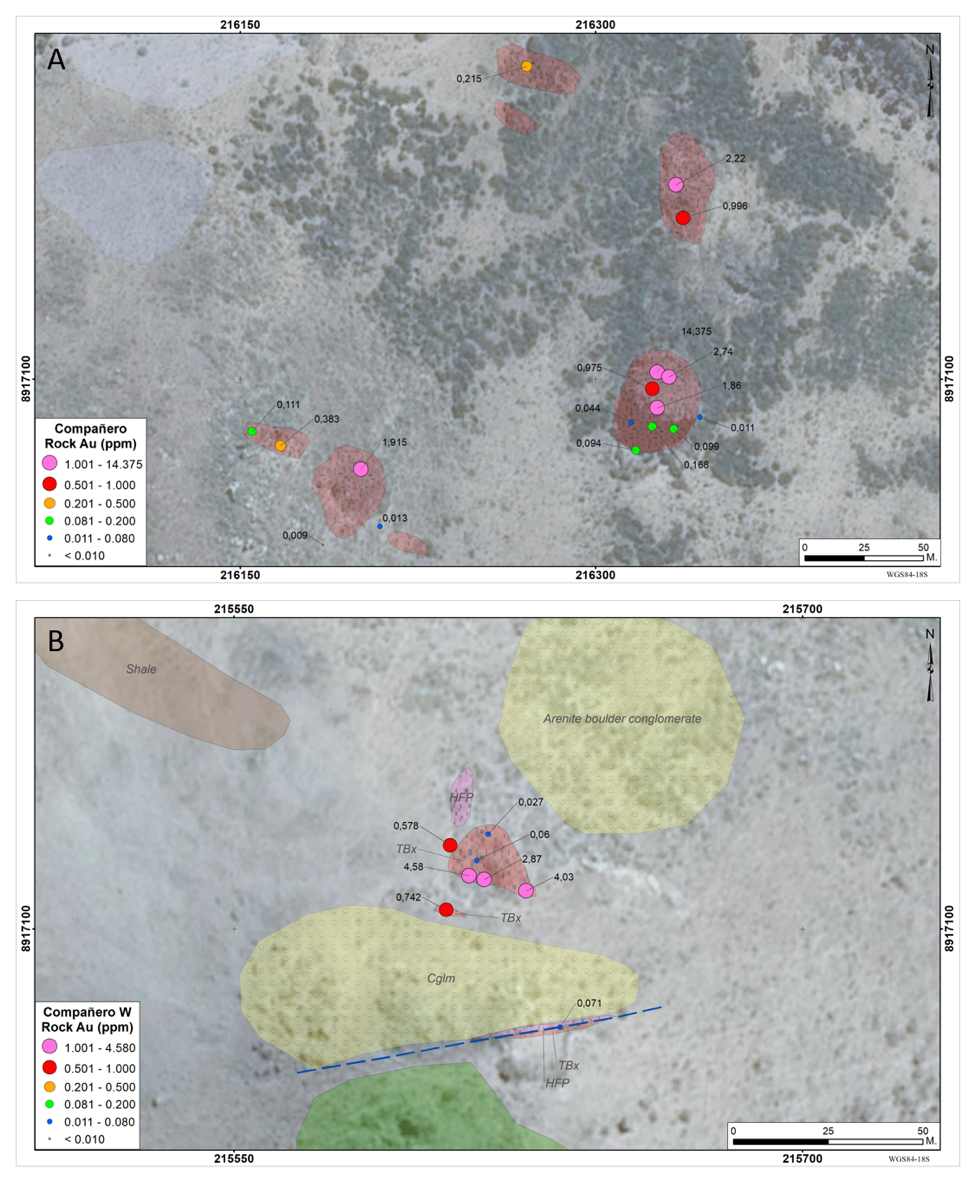 Figure 3 – Maps showing gold in surface composite rock chip samples collected by Chakana over (A) the main Compañero cluster, and (B) the Compañero West pipe. Readers are cautioned that surface rock samples are, by nature, selective and are unlikely to represent average grades on the Project.