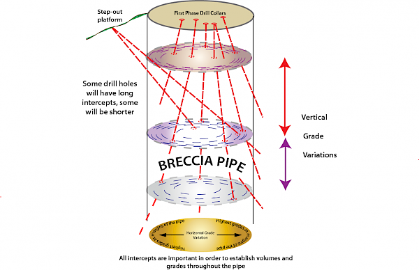 Figure 2 – Diagram showing relationship between drill intercepts and breccia pipe geometry with emphasis on vertical and horizontal grade variation. For the purpose of the orientation of the disclosed drill holes, the Company assumes that the breccia pipe is orientated vertically.