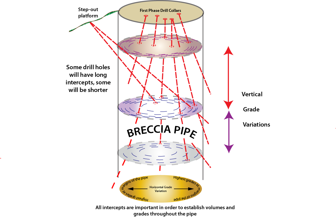 Figure 2 – Diagram showing relationship between drill intercepts and breccia pipe geometry with emphasis on vertical and horizontal grade variation. For the purpose of the orientation of the disclosed drill holes, the Company assumes that the breccia pipe is orientated vertically.
