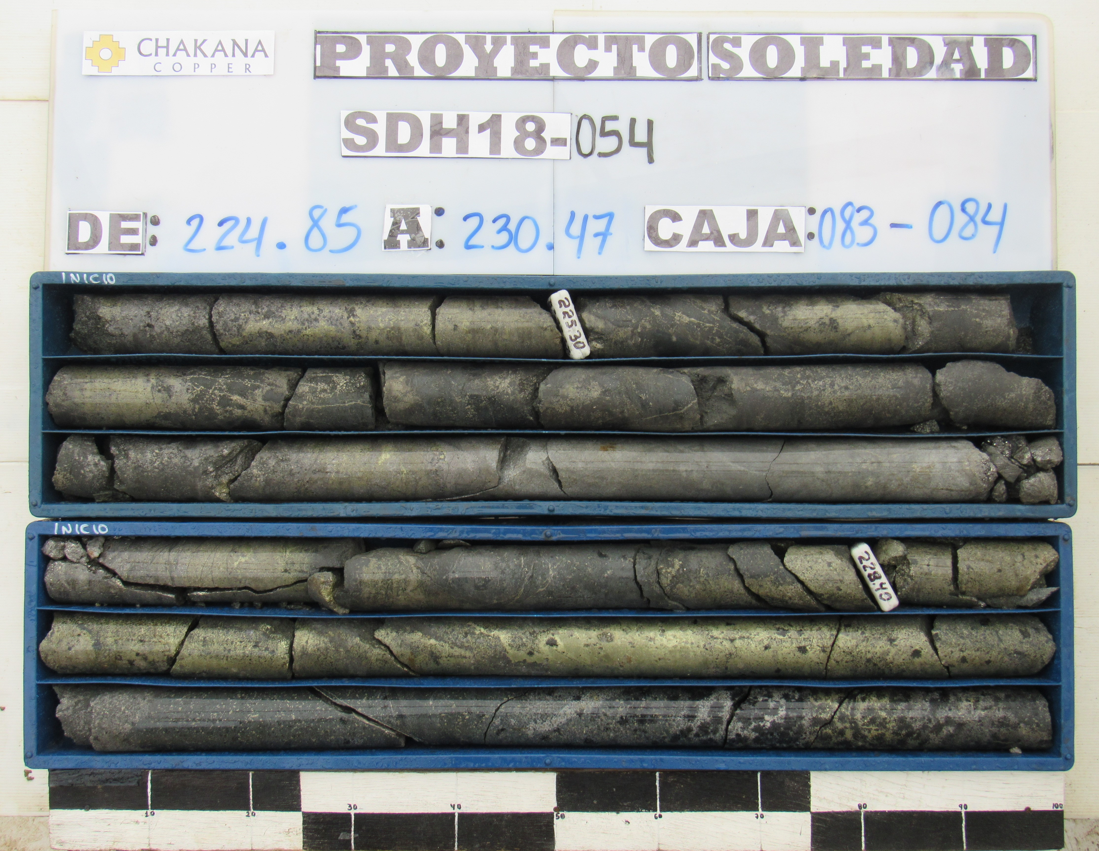 Figure 2 – High grade intercepts from four of the five holes reported in this release showing different styles of mineralization in Bx 1: SDH18-053 classic shingle breccia with matrix sulfides, interval from 44.0-49.0 averages 3.37% Cu, 9.33 g/t Au, and 30.0 g/t Ag; SDH18-054 massive to semi-massive sulfides in tourmaline breccia, interval from 224.5-230.0 averages 4.90% Cu, 4.22 g/t Au, and 252.5 g/t Ag; SDH18-055 mosaic breccia with sulfides in matrix and partially replacing clasts, interval from 46.3-52.0 averages 1.99% Cu, 14.12 g/t Au, and 27.3 g/t Ag; SDH18-057 chaotic shingle breccia with matrix sulfides, interval from 53.0-59.0 averages 3.46% Cu, 10.39 g/t Au, and 30.4 g/t Ag.