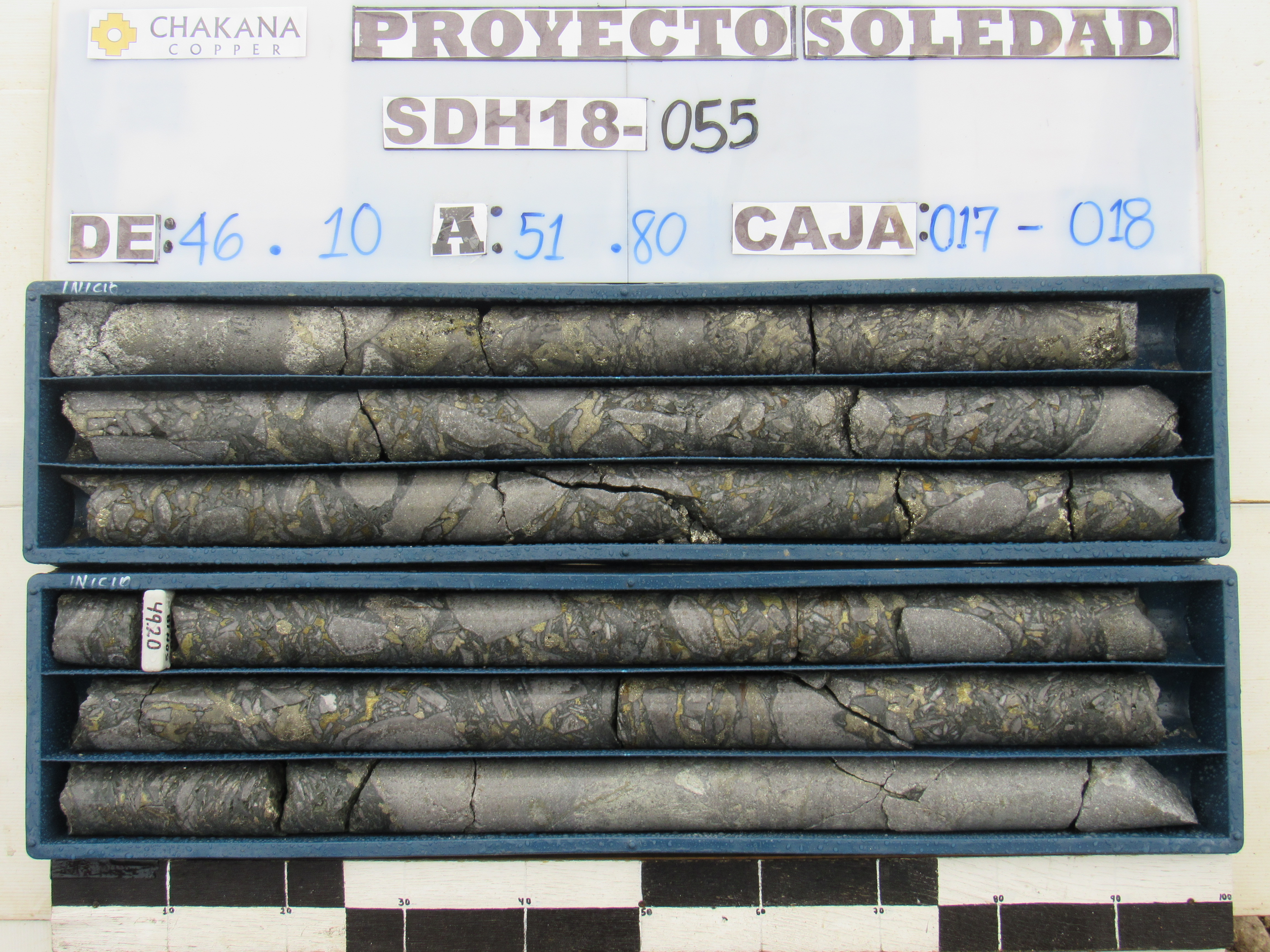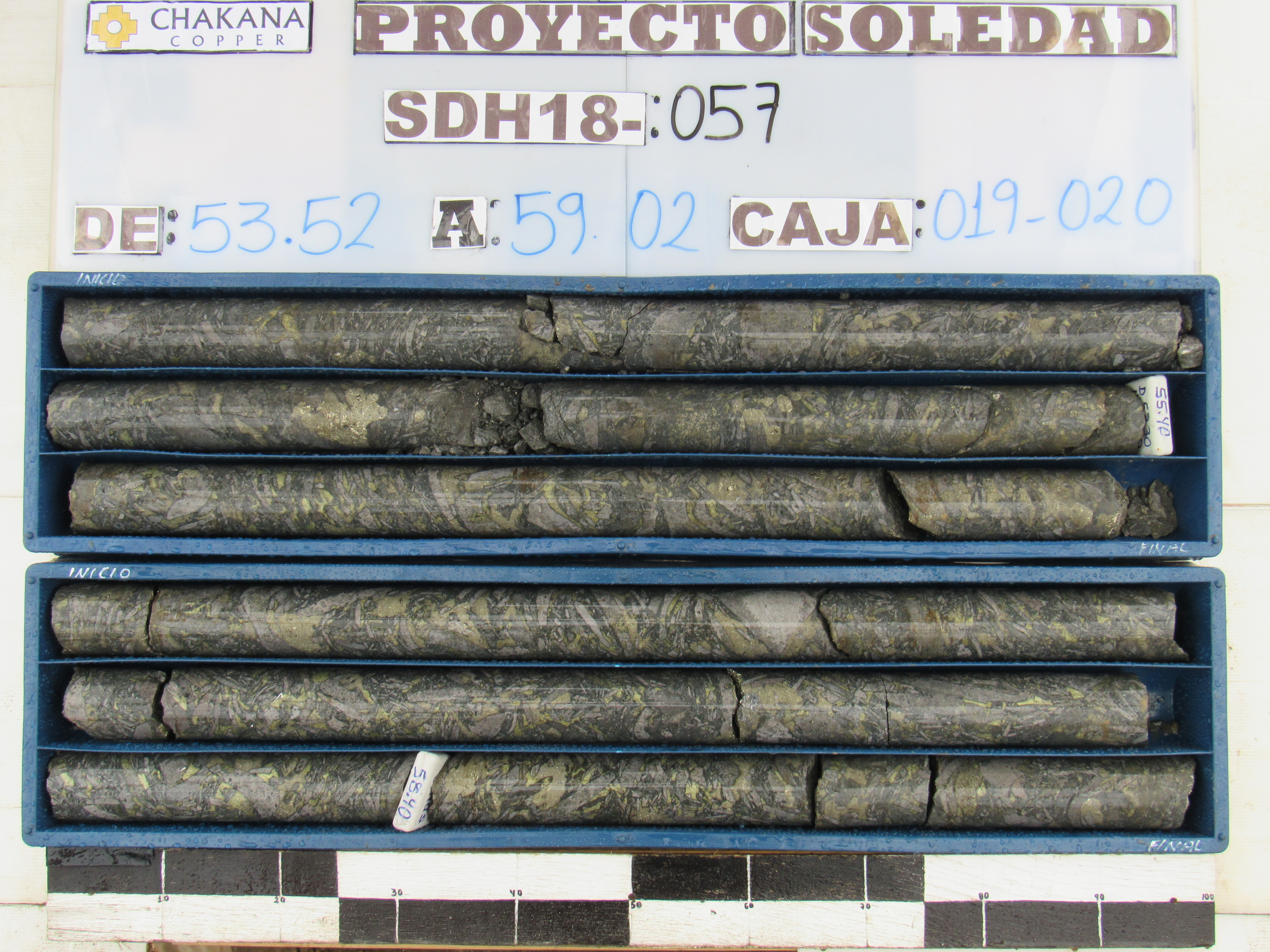 “These latest results continue to highlight the high grade nature of Bx 1 from surface,” said President and CEO David Kelley. “All of the holes penetrate the upper supergene zone where copper is leached, but gold is retained. Beneath this, copper, gold and silver are strongly enriched in the primary zone with abundant visible chalcopyrite mineralization (Fig. 2). Holes 54 to 57 also penetrate a lower mineralized zone with copper grades in excess of 1.58%. In holes 56 and 57, the upper part of this zone is strongly mineralized with 22m of 2.96% Cu and 1.30 g/t Au, and 23m of 2.82% Cu and 1.10 g/t Au, respectively. Most of the mineralization occurs as matrix sulfides in either shingle or mosaic breccia, but hole 54 shows some very impressive massive and semi-massive sulfide zones dominated by chalcopyrite (Fig. 2). It’s also important to note that hole 34, drilled to the southwest from a step out platform 80 northeast of the central platform, intersected the southwest margin of the breccia pipe approximately 100 to 125m below the mineralized breccia zone in holes 54 to 57 and returned 71.4m of 1.53% Cu, 1.05 g/t Au and 81.7 g/t Ag from 317.6m, including a very high-grade margin zone with 34.4m of 2.84% Cu, 1.30 g/t Au and 89.3 g/t Ag from 354.6m (see news release dated February 22, 2018 at www.chakanacopper.com). Our drill program will continue to track this impressive mineralization to depth.” states Kelley.