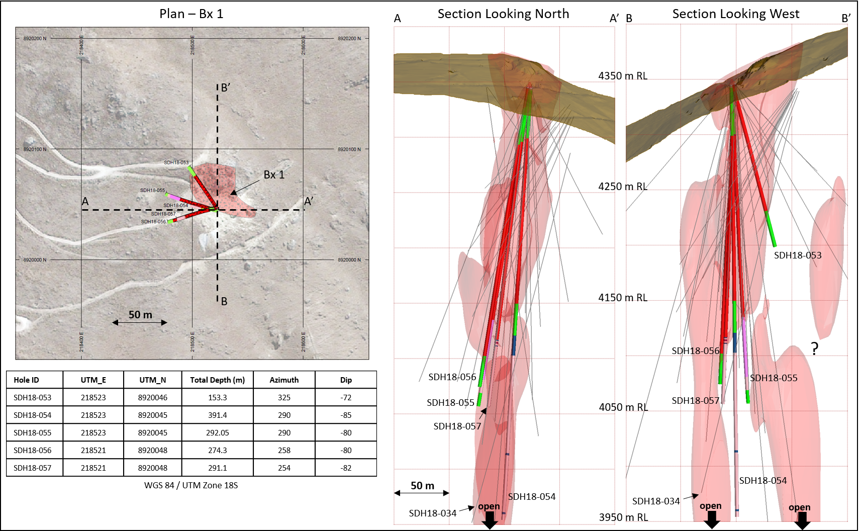 Figure 1 (above) – Plan and sections highlighting holes in this release. Light red 3D shapes based on Leapfrog model from all holes drilled by Chakana. Highlighted drill holes SDH18-053 to SDH18-057 show tourmaline breccia (red), andesitic wall rock (green), and other host rocks (other colors). Light grey traces show other holes drilled by Chakana projected onto section from 37.5m in front of and behind section.