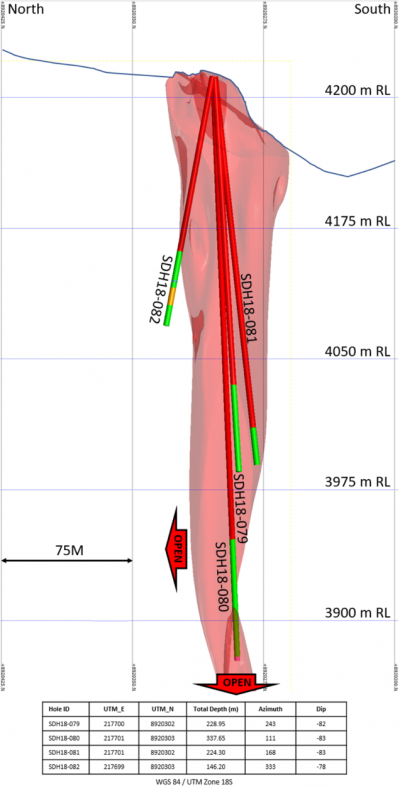 Vancouver, B.C., November 13, 2018 – Chakana Copper Corp. (TSX-V: PERU; OTC: CHKKF; FWB: 1ZX) (the “Company” or “Chakana”), is pleased to announce additional results from infill drilling on Breccia Pipe 5 (Bx 5) at the Soledad copper-gold-silver project in central Peru (the “Soledad Project”). All drilling to date has been on the portion of the Soledad Project optioned from Condor Resources Inc. The four holes reported here were designed to explore the upper 250m extent of the breccia pipe (Figs. 1 and 2). Chakana had previously released nine drill holes from Bx 5 (see news release dated February 22, 2018 at www.sedar.com), including 164m with 0.51% Cu, 1.68 g/t Au and 27.4 g/t Ag (1.84% Cu_EQ; 2.82 g/t Au_EQ) from 12m in hole SDH17-041.