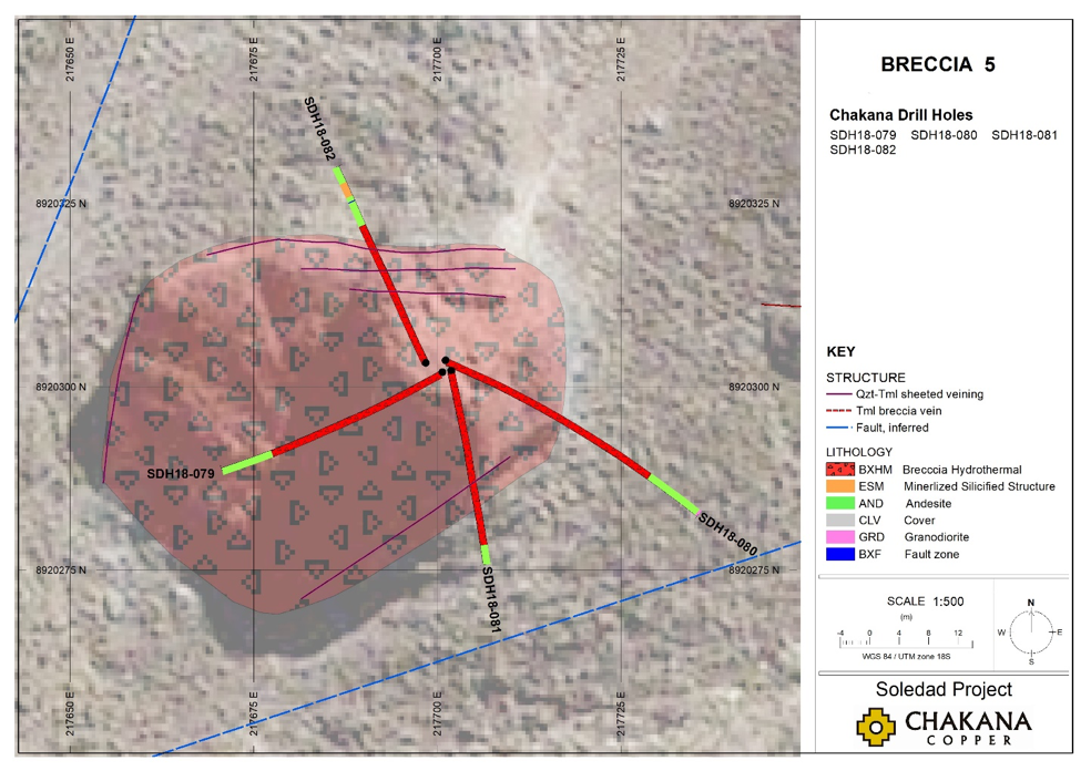 Vancouver, B.C., November 13, 2018 – Chakana Copper Corp. (TSX-V: PERU; OTC: CHKKF; FWB: 1ZX) (the “Company” or “Chakana”), is pleased to announce additional results from infill drilling on Breccia Pipe 5 (Bx 5) at the Soledad copper-gold-silver project in central Peru (the “Soledad Project”). All drilling to date has been on the portion of the Soledad Project optioned from Condor Resources Inc. The four holes reported here were designed to explore the upper 250m extent of the breccia pipe (Figs. 1 and 2). Chakana had previously released nine drill holes from Bx 5 (see news release dated February 22, 2018 at www.sedar.com), including 164m with 0.51% Cu, 1.68 g/t Au and 27.4 g/t Ag (1.84% Cu_EQ; 2.82 g/t Au_EQ) from 12m in hole SDH17-041.