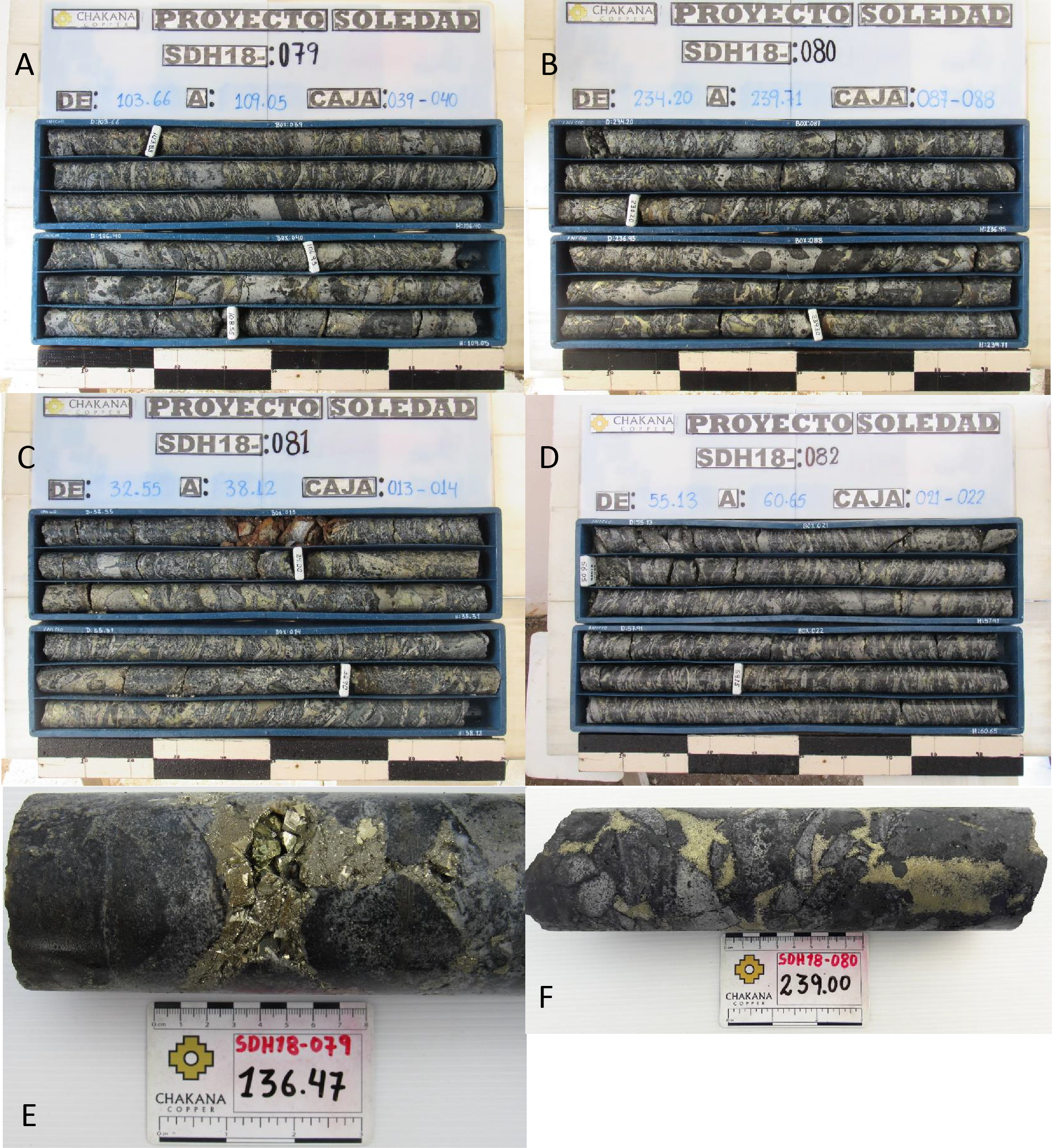 Figure 3 – Mineralized intercepts from drill holes reported in this release showing different styles of mineralization in Bx 5: A) SDH18-079 – high-grade shingle breccia with larger blocks of andesite tuff; the interval 103-109m assays 8.43 g/t Au, 2.24% Cu, and 46.5 g/t Ag; B) SDH18-080 – high-grade chaotic shingle breccia and mosaic breccia; the interval 234-240m assays 2.30 g/t Au, 3.29% Cu, and 27.2 g/t Ag; C) SDH18-081 – high-grade chaotic shingle breccia; the interval 32-38m assays 2.94 g/t Au, 1.73% Cu, and 64.3 g/t Ag; D) SDH18-082 – high-grade shingle breccia; the interval 55-60m assays 0.90 g/t Au, 1.82% Cu, and 92.7 g/t Ag; E) euhedral chalcopyrite and pyrite in SDH18-079 at 136.47m; F) chalcopyrite filling open space in breccia matrix intergrown with fine tourmaline crystals rimming fragments and larger quartz crystals; SDH18-080 at 239m.