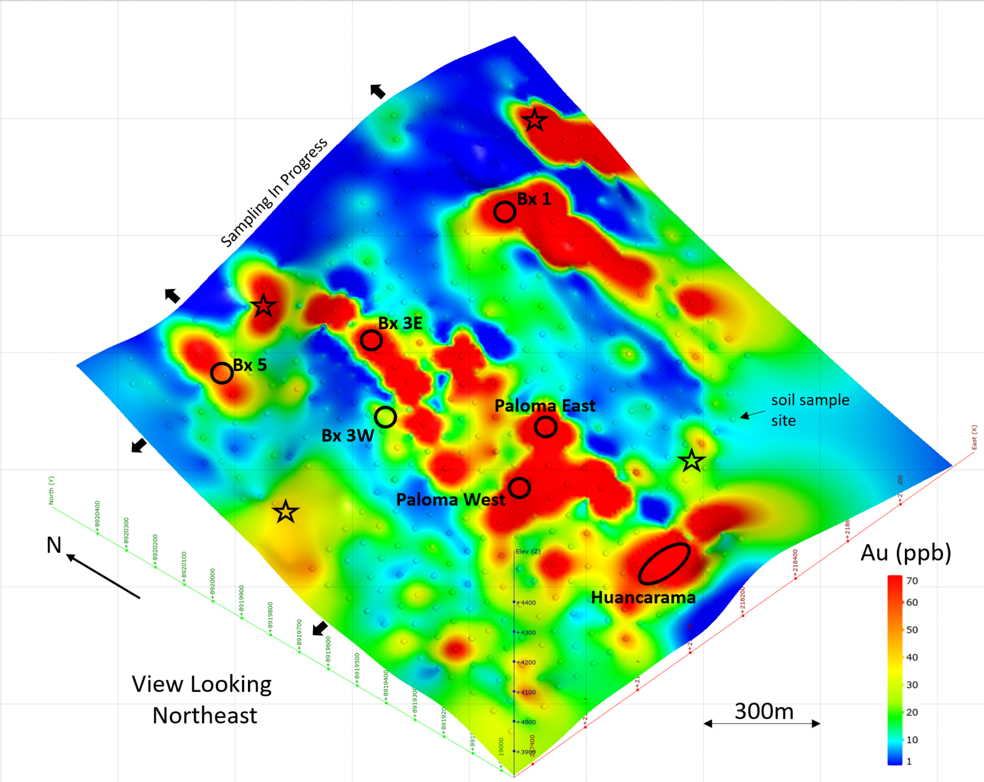 To date, soil results for gold show a strong correlation with the known breccia pipes and further highlight several additional exploration targets (Fig. 4). There is a corridor of anomalous gold extending NNE from Huancarama to Bx 5, an area of approximately 1,400m by 300m. “The soil geochemistry is working exceptionally well in identifying exploration targets, particularly in areas with little or no outcrop. There is a very impressive anomaly northeast of Bx 1 where mineralized breccia is poorly exposed. Other areas of interest include anomalies east of breccias Bx 5 and Bx 3W, and a continuous anomaly surrounding and extending beyond the Paloma East and West pipes. South of this area, a broad area of anomalous gold in soil 400m by 100m surrounds the Huancarama Breccia Complex,” stated Kelley.