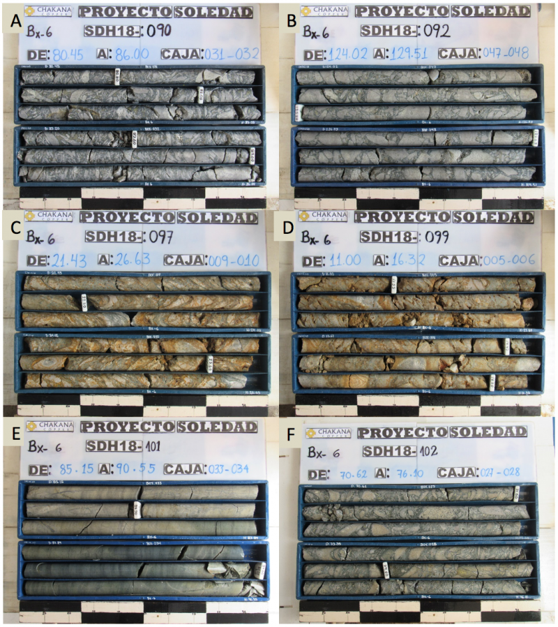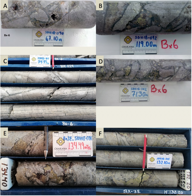 Figure 4 – Mineralized intercepts from drill holes reported in this release showing different styles of mineralization in Bx 6: A) SDH18-090 – chaotic shingle breccia with tourmaline-sulfide matrix; the interval 80.0-86.0m assays 1.77 g/t Au, 0.97% Cu, and 240.7 g/t Ag; B) SDH18-092 –mosaic breccia with tourmaline-sulfide matrix; the interval 124.0-129.0m assays 0.80 g/t Au, 0.36% Cu, and 249.8 g/t Ag; C) SDH18-097 – oxidized shingle breccia; the interval 21.0-26.0m assays 1.01 g/t Au, 0.04% Cu, and 140.8 g/t Ag; D) SDH18-099 – oxidized mosaic breccia with variable clast sizes; the interval 11.0-16.0m assays 0.77 g/t Au, 0.05% Cu, and 161.8 g/t Ag; E) SDH18-101 – sheeted quartz-tourmaline-sulfide veining in porphyritic andesite host rock; the interval 85.0-89.50m assays 6.59 g/t Au, 0.02% Cu, and 71.8 g/t Ag; F) SDH18-102 – mixed mosaic and chaotic shingle breccia with tourmaline-sulfide matrix; the interval 71.0-76.0m assays 2.07 g/t Au, 1.95% Cu, and 3,023.0 g/t Ag.