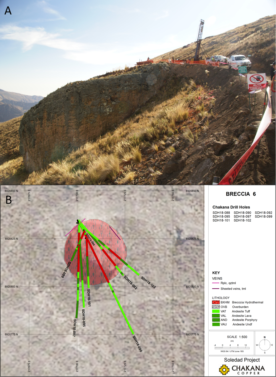 Figure 2 – A) view looking west of drill set up at Bx 6; B) map showing drill holes with geology discussed in this release.