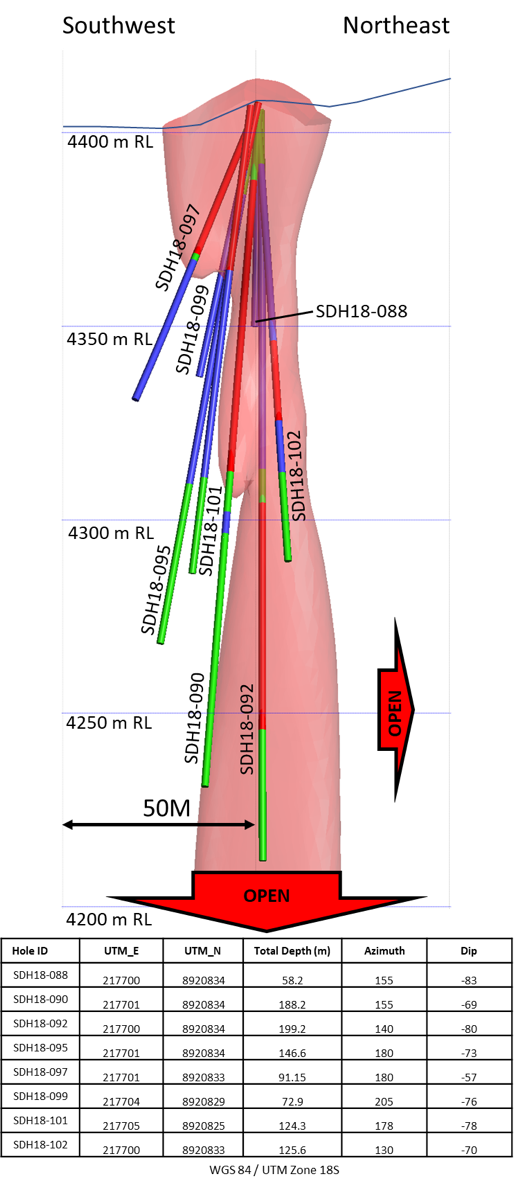 | SDH18-088 | 155 | -83 | No breccia intersected | 58.2m depth | |||||||