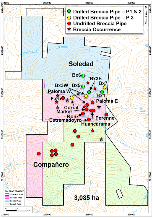 The current drill program is the continuation of the Phase 3 drill program initiated in June, 2019. A total of 5,717m of diamond drilling were completed at that time, with important mineralization encountered in Breccia Pipe 7 (“Bx 7”) and high-grade extension of mineralization in Bx 5 (see news releases dated July 29, 2019 and September 10, 2019). Drilling was suspended in October 2019 to await permits that allowed drill testing of targets in the expanded mineral rights (see news release dated May 23, 2018) and was further delayed by the COVID-19 Pandemic.