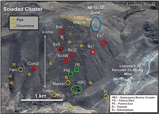 Figure 2 – View looking north at north-half of the project area showing drilled breccia pipes (red), untested targets (gold), and targets to be tested in the next drill program (Paloma East, Paloma West, Huancarama Breccia Complex). Additional targets on the south-half of the project not shown.
