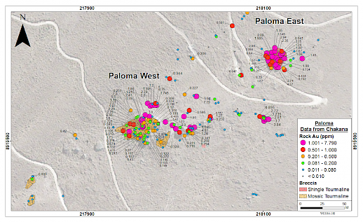The Paloma target area is characterized by two prominent outcropping breccia pipes, Paloma East and Paloma West, and several smaller exposures of mineralized breccia, vein breccia, and silicified structures (Fig. 3). The breccia pipes and occurrences are aligned along a northeast trend, likely controlled by structures. Paloma East is the exposed top of a breccia pipe with a conical shape and altered wall rock preserved around the contact with the breccia. The alteration consists of quartz-sericite replacement of lithic tuff, cut by quartz-tourmaline veins. Mineralized breccia is exposed where the altered wall rock is eroded. Previous rock chip and channel sampling in the Paloma target area returned numerous multi-gram gold assays indicative of significant mineralization encountered in other previously drilled breccia pipes with similar surface geochemical expression.