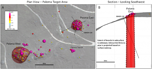 Figure 4 – Initial drill plan for the Paloma target area: A) map showing the Paloma East and Paloma West breccia pipes and surface rock assays for gold. Initial platforms at Paloma East are indicated by the collar locations. Additional holes may be drilled from these collar locations. B) section in the plane of the current drill hole being drilled, SDH20-113.