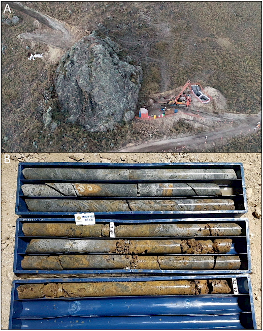Figure 5 – Images from current drill hole SDH20-133: A) drone image of Paloma East breccia pipe with drill set up on SDH20-133; B) strongly sericite-tourmaline altered lithic tuff and contact with tourmaline breccia at 18.6m. Note sheeted veining at contact. Abundant iron oxides after sulfides.