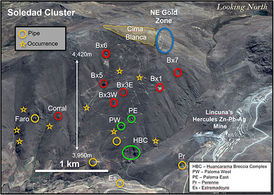 Figure 1 – View looking north showing breccia pipes and occurrences within the northern Soledad cluster. Pipes that have been drilled in previous campaigns are shown in red. Targets shown in green are the focus on this 15,000m drill campaign. Other pipes and occurrences remain to be tested by drilling. Additional breccia pipes occur on the south half of the property and are not shown here.