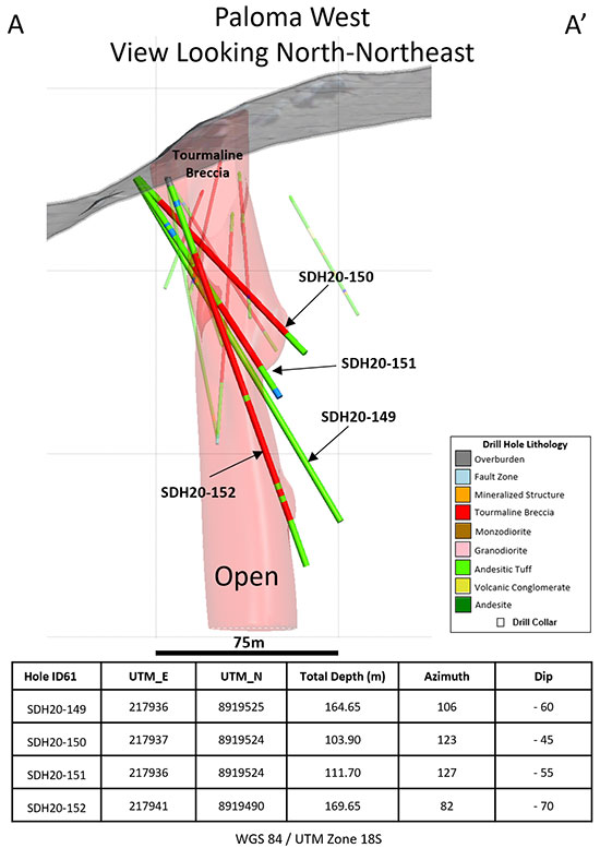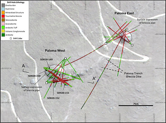 David Kelley, President and CEO commented, “these results are a successful conclusion to the scout drilling program at Paloma East and Paloma West, defining a breccia system much larger than anticipated with some of the highest grades ever seen on the project. The three holes that intersect breccia have high grade sections within longer intervals of mineralization. Hole SDH20-152 significantly extends mineralization to approximately 165m below surface and is open at depth. Additional in-fill drilling will be conducted at Paloma East and Paloma West to be included in an initial resource estimate. We look forward to reporting drill results from the Huancarama Breccia Complex early in the new year.”