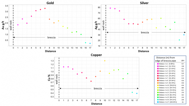 Figure 3 – Average metal values in core samples located at various distances (m) from margin of breccia pipe (relative position of contact with wall rock shown as vertical dashed line) for gold, silver and copper. Number of samples included in each interval distance shown in legend.