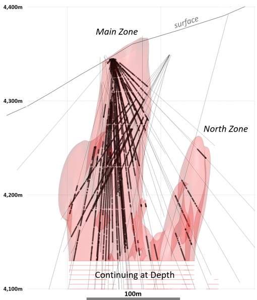 Previous drilling at Bx 1 outlined mineralization to a depth of approximately 490m. During drilling, the shape of the breccia pipe was modeled using observed contacts measured by geologists logging core. The breccia pipe and mineralization are open at depth. The pipe forms a prominent bulge in the hill side at surface where it has been exposed by erosion. A second, blind breccia pipe was discovered 40m north of the main pipe (North Zone, Fig. 1) while drilling Bx 1 (Main Zone). The top of the North Zone is approximately 125m below surface. Given the proximity of the Main and North zones, data from each pipe were evaluated together.