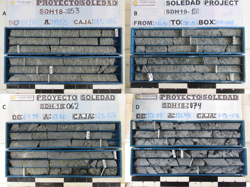 Chakana has now identified twenty-three tourmaline breccia pipes on the Soledad land package and drill tested seven pipes to date. A unique aspect of tourmaline breccia pipe formation is that they do not reach the paleosurface; they occur at different elevations and are exposed at surface by erosion of the overlying rock column. They originate from a fluid-saturated intrusion at depth due to the accumulation of over-pressured volatile gases leading to a violent eruption that breaks the overlying rock column above the intrusion. Subsequently hydrothermal fluids invade the brecciated rock column, precipitating sulfide mineral assemblages in the void spaces in the breccia (cement) and often replacing clasts and matrix. Typical characteristics of tourmaline breccia pipes include 1) they continuously span vertical heights of 500 metres and more, 2) shapes that increase in diameter at depth toward the causative intrusion, 3) angular to flat tabular breccia clasts demonstrating minimal transport, 4) high amount of open space between the breccia fragments due to limited development of fine rock debris (“rock flour”), 5) sub-horizontal shingle breccia textures from clasts collapsing downward in the breccia pipe, and 6) high porosity of the breccia, particularly at the margin where the breccia contacts the wall rock. Elsewhere in South America, alteration mineral assemblages transition from quartz-tourmaline-sericite in the upper portion of the breccia pipe, to quartz-tourmaline-magnetite-secondary biotite in the deeper portion of the breccia pipe closer to the intrusion. Secondary biotite has not been seen within the breccia at Soledad in drilling to date, suggesting that the lower portions of the breccia pipes and the causative intrusion are preserved at depth.