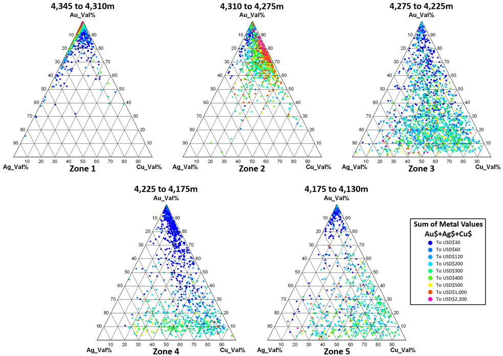 Figure 4 – Ternary plots showing relative metal value for gold, silver, and copper for the five elevation zones (above sea level). Colored dots represent total metal value for each sample interval using USD$1,500 oz gold, USD$18 oz silver, and USD$2.50 lb copper.