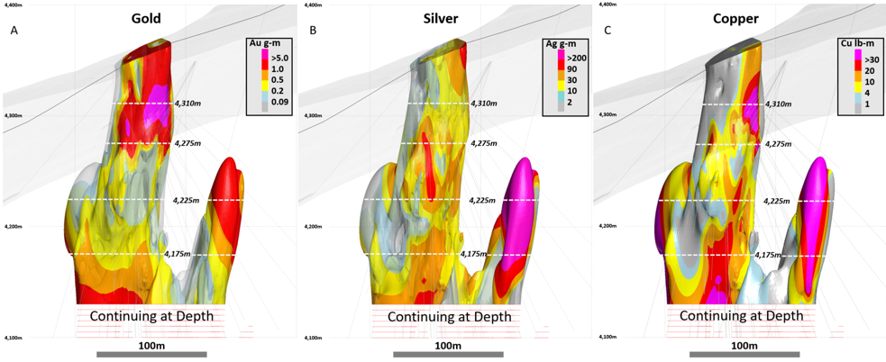 Figure 5 – View looking west showing distribution of: A) gold, B) silver, and C) copper in the top 215 metre extent of Bx 1. Values plotted are gram-metre for gold and silver, and pound-metre for copper. Elevation ranges shown in Figure 4 indicated by dashed white lines.
