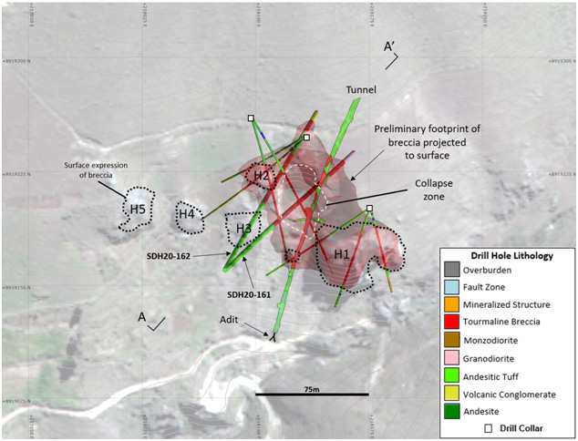 Figure 2 – Map of the Huancarama Breccia Complex and drill hole lithology in holes completed to date. Red represents tourmaline breccia based on the first ten holes and lithology mapped in the underground tunnel. Black dotted outlines show surface expression of mapped breccias; white dashed line shows collapse zone. Location of section line for Figure 3 indicated.