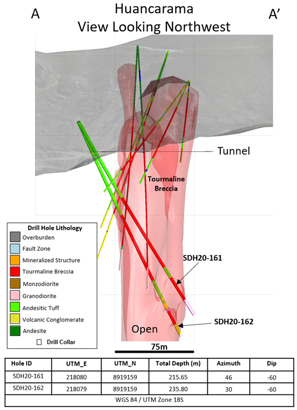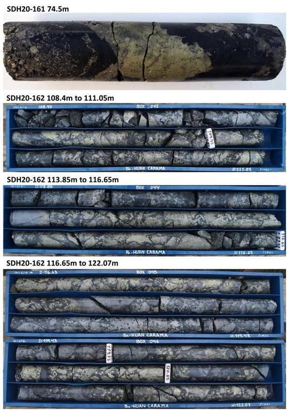 David Kelley, President and CEO commented, “these two holes were drilled from a new platform on the south side of the Huancarama Breccia Complex and confirm the breccia geometry previously reported with approximate horizontal dimensions of 100m by 50m, one of the largest breccias we have discovered to date at Soledad. The mineralized breccia crops out at surface and extends to a vertical depth of approximately 225m below surface and is open at depth. The results demonstrate good continuity of mineralization within the breccia with excellent grades. The high-grade zone within hole SDH20-162 shows copper sulfide-cemented breccia and the late copper sulfide replacement process that we have seen in several other high grade breccia pipes at Soledad. Drilling is ongoing at Huancarama and we look forward to reporting additional drill results in the near future.”