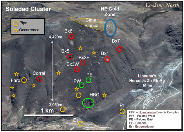Figure 1 – View looking north showing breccia pipes and occurrences within the northern Soledad cluster. Pipes that have been drilled in previous campaigns are shown in red. Targets shown in green are the focus on this 15,000m drill campaign. Other pipes and occurrences remain to be tested by drilling. Additional breccia pipes occur on the south half of the property and are not shown here.