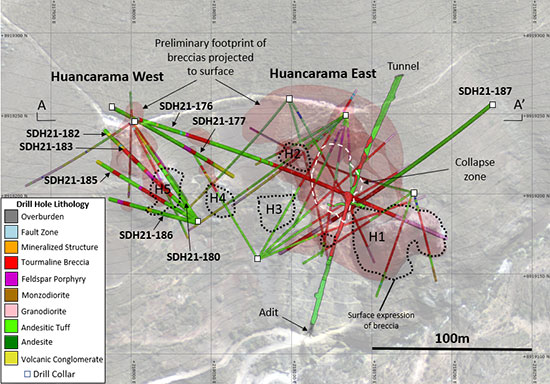 Figure 2 – Map of the Huancarama Breccia Complex and drill hole lithology in holes completed to date. Red shapes projected to surface represents tourmaline breccia pipes based on all holes drilled to date and lithology mapped in the underground tunnel. Black dotted outlines show surface expression of mapped breccias (H1-H5); white dashed line shows collapse zone. Location of section line for Figure 3 indicated.