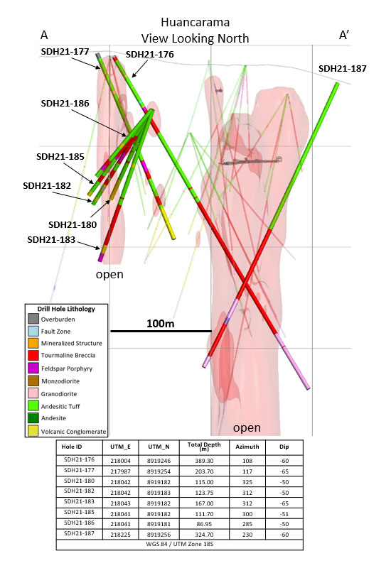 Figure 3 – Section looking north highlighting the drill holes at Huancarama reported in this release. Light red 3D shapes show preliminary shape of breccias based on all drill holes.