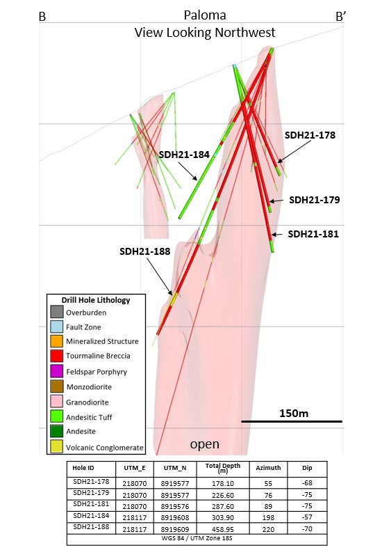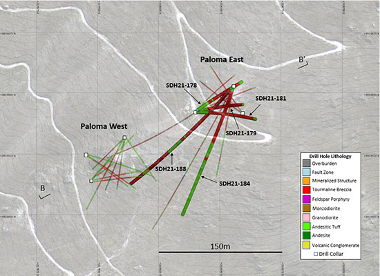 At Paloma East, five holes were drilled as part of the resource drilling program (Figs. 4 and 5). Three holes were set up on the west side of the breccia pipe and drilled to the east, and two holes were set up on the northeast side and drilled to the southwest. Shallow mineralization was encountered in all five holes. Hole SDH21-188 intersected 163.9m of mineralized breccia starting at surface, then continued to the southwest where strongly pyritic breccia was encountered at depth. Examples of mineralized drill core from these holes are shown in Figure 7. Additional infill drilling is being planned for the shallow mineralized zone at Paloma East.