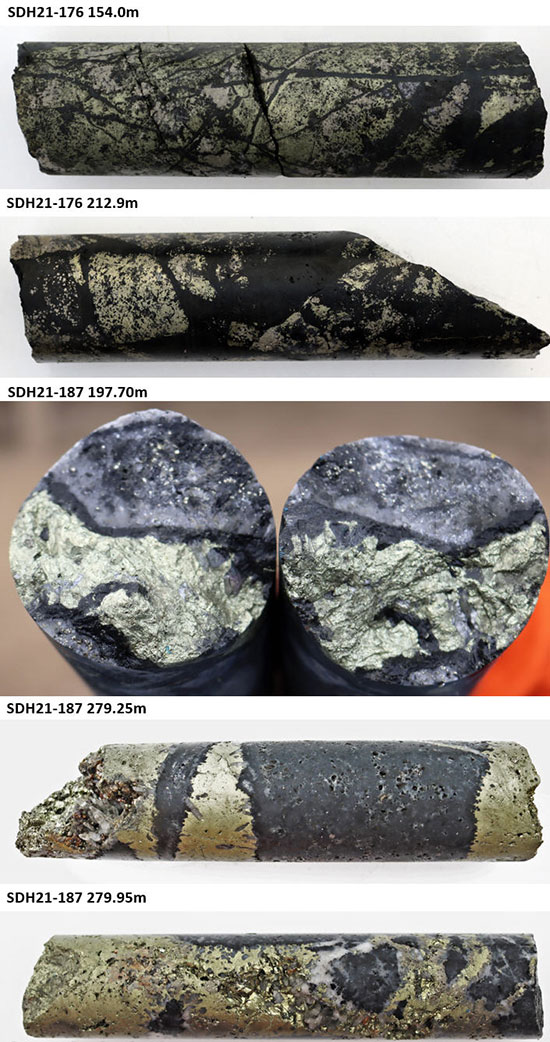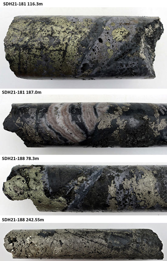 Figure 7 – Paloma East core photos from drill holes reported in this release: SDH21-181 (116.3m) Mosaic breccia clasts replaced by chalcopyrite-pyrite; SDH21-181 (187.0m) Tourmaline breccia with clasts of banded siderite; SDH21-188 (78.3m) Tourmaline mosaic breccia with coarse chalcopyrite cement (left) and pyrite clast replacement (right); SDH21-187 (279.25m) Pyrite-replaced tourmaline breccia typical of the deeper parts of Paloma East (note euhedral pyrite crystals). Core diameter is 6.35cm (HQ) in all instances.