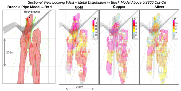 Figure 1 – Sectional view of Breccia Pipe 1 (Bx 1) showing grade distribution for gold, copper, and silver, within the Inferred Resource block model above a US$60/tonne cut-off. Mineralization is open at depth.